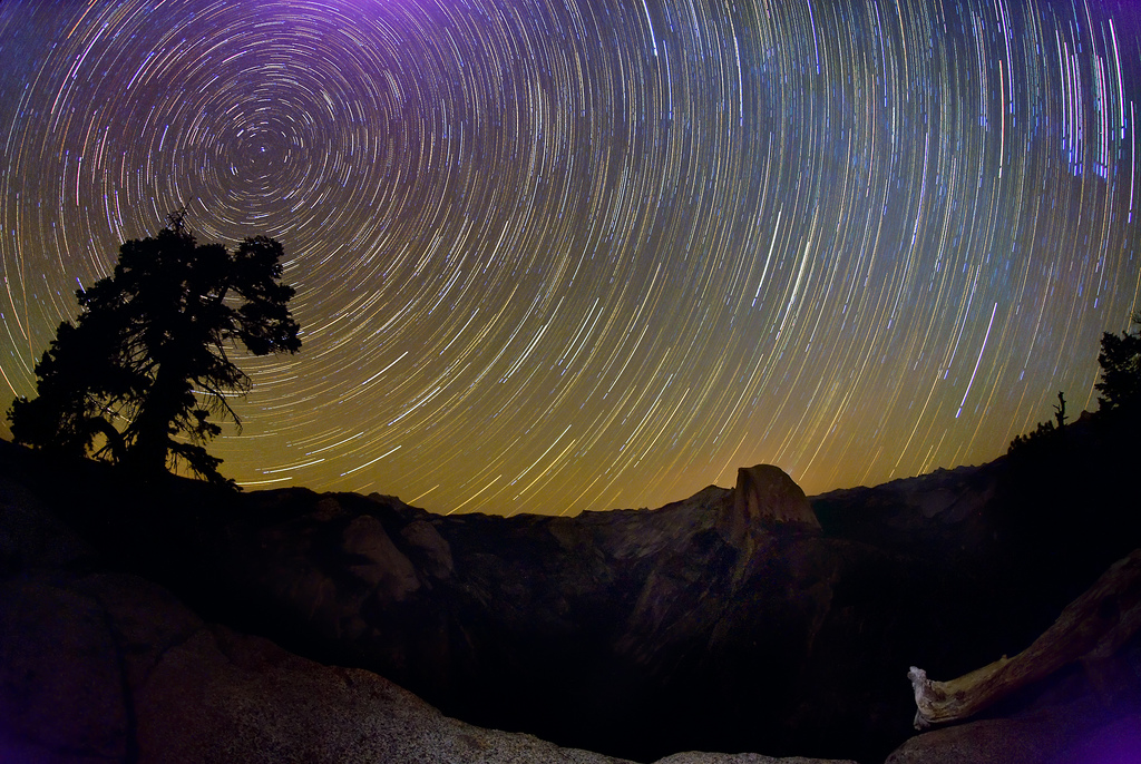 This fisheye starry night stacked photo from Glacier Point consists of 12 captures at four minutes and ISO 100 and f/3.2, and one high ISO capture at four minutes and ISO 800 and f/4. The bright purple comes from sensor flaring in the higher ISO capture in the stack. I intentionally left the foreground dark (the way it looks in the individual exposures) rather than trying to blend in a brighter foreground….Starry Night 3 |