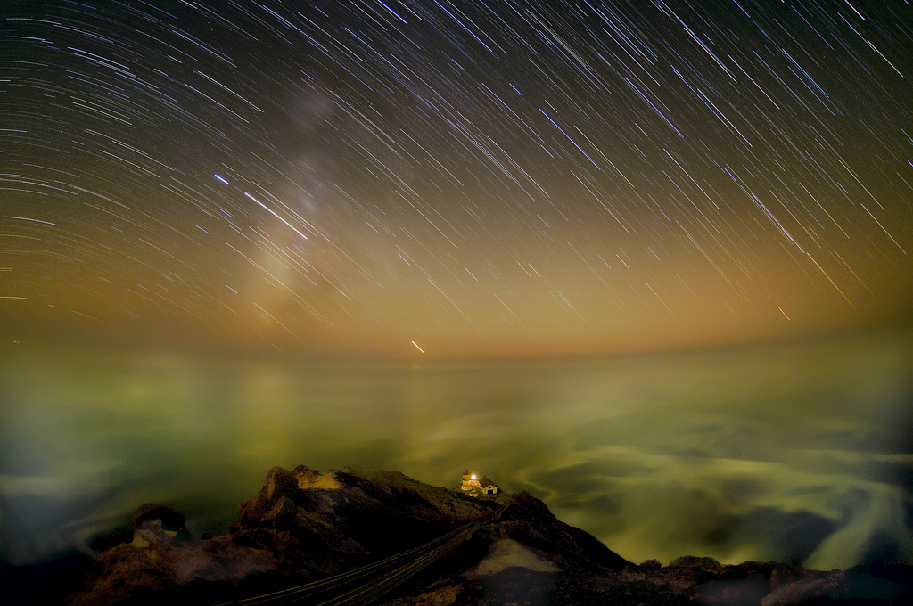 Against the backdrop of pounding surf and a light mist on the ocean, I photographed star trails behind Point Reyes Lighthouse in this portrait of the edge of night….Edge of Night |